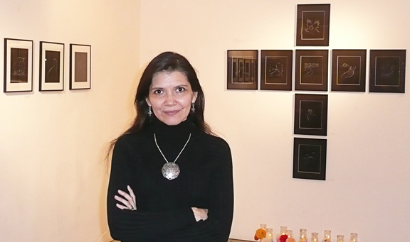 The artist, Andrea Arroyo stands in front of the collection Flor de Tierra, Homage to the Women of Juárez.