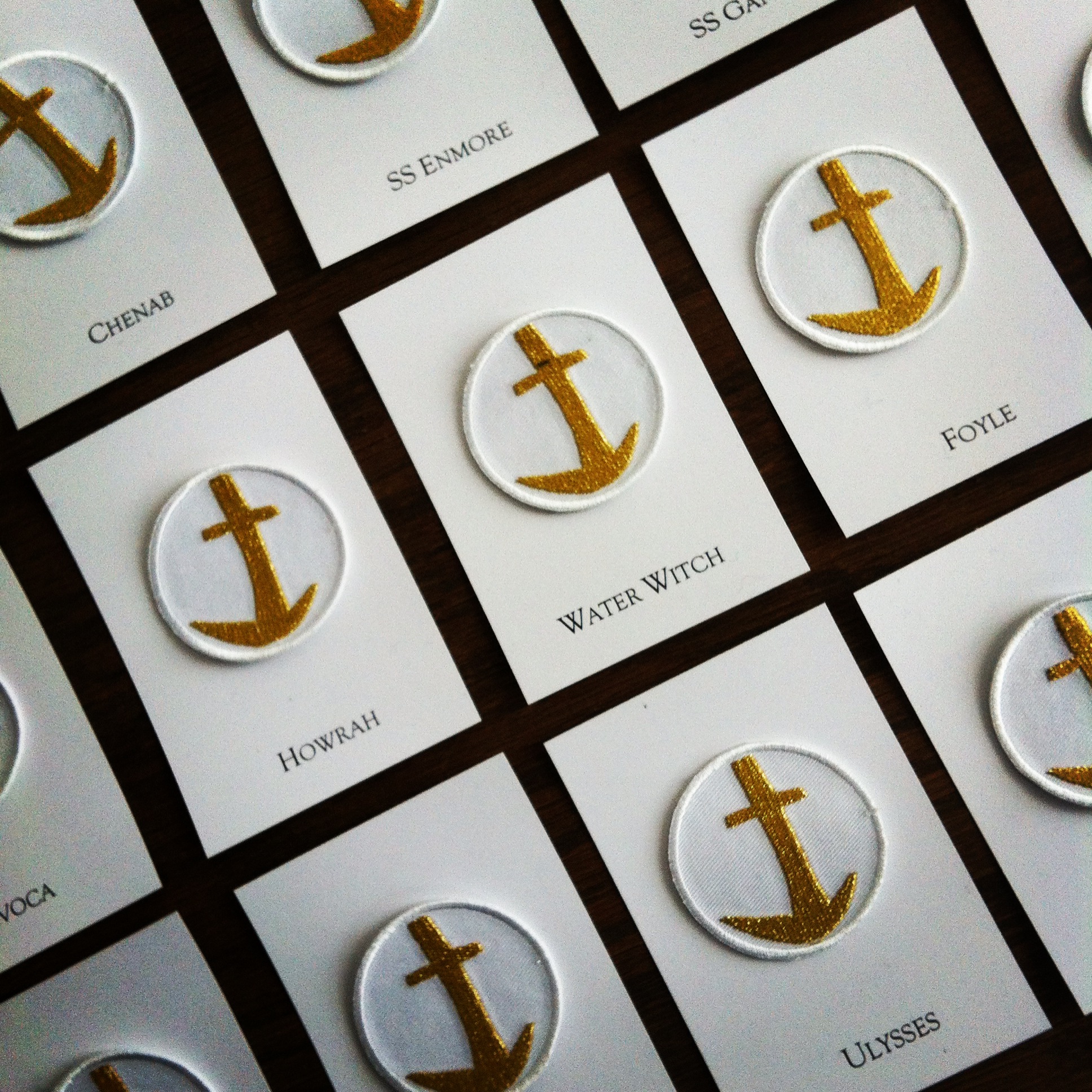 Accompanying the performance, Gosine has designed an anchor, based on a tattoo worn by his Ahji (grandmother), a memory of ocean crossing engraved on the body. He reproduced multiple embroidered copies in gold thread, with each anchor representing a voyage (one anchor per each indenture ship that sailed, its name underneath). Rivers are also invoked in the names of ships (e.g., The Foyle, a river in Scotland; The Chenab, a river in India; The Howrah, a bridge over the Hooghly River). Collectively the ships represent indentured migrancy, the vessels which carried ancestors to the region. Personally, each individual ship holds meaning as a genealogy. Kinship ties (jahaji bhai and bahin) refer to brothers and sisters of the ship, those whose travels were contained in the same vessel and are now linked by memory.